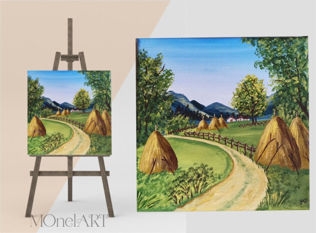 Hand-painted artwork, acrylics on canvas on chassis, 16 x 16 cm (6×6 inch), does not require framing and the easel is not included. Available.