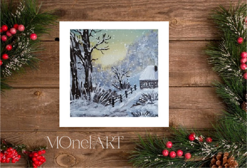 Hand-painted artwork, acrylics on canvas on chassis, white margins, 16 x 16 cm (6×6 inch), does not require framing. Available.