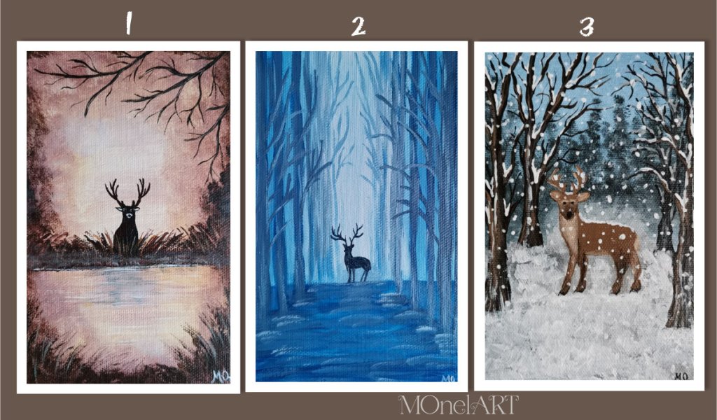 Hand-painted artwork, acrylics on canvas cardboard, white margins, 12 x 18cm (5 x 7 inch), 3 models. Available.