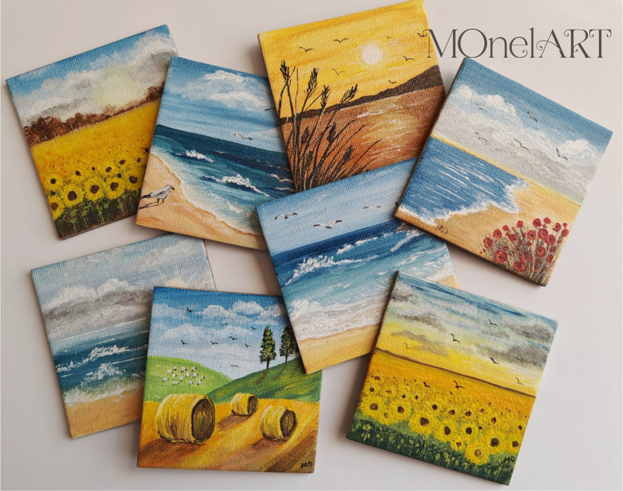 The set includes 8 hand-painted magnets, each with a unique design. Materials used: cardboard, canvas, acrylic paints, magnetic sheet. Size per piece: 7,5 x 7,5 cm (3 x 3 inch). Available.