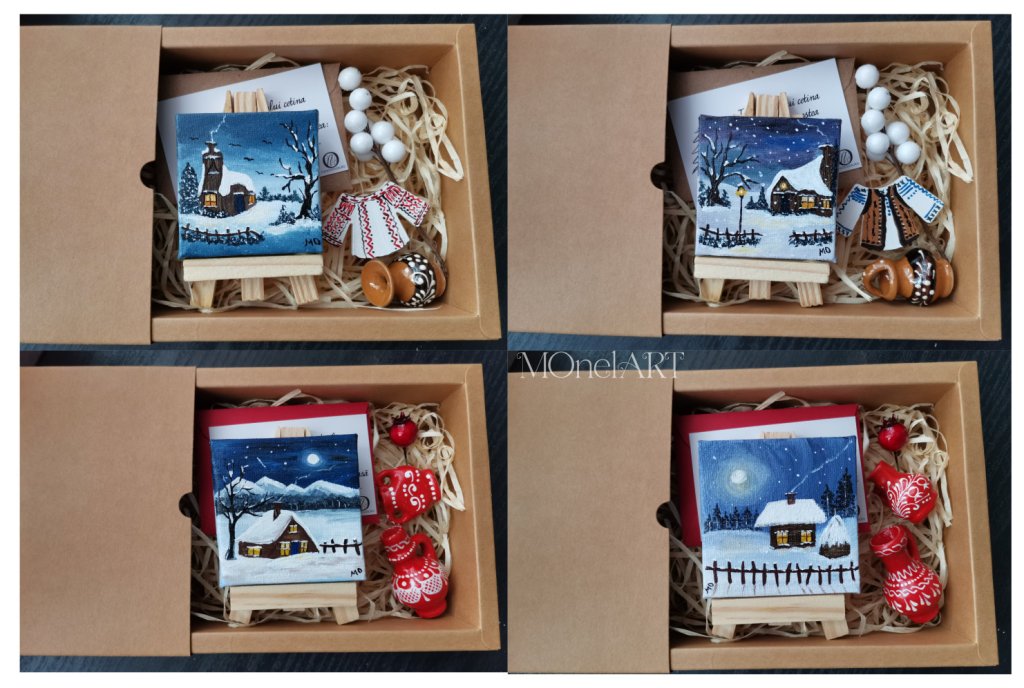 The gift box is part of the ‘Romanian Gifts’ project, an original project by MOnel Art. There are 14 sets available. Price: 35 Euro/set (6 x 6 cm painting), or 40 Euro/set (7 x 7 cm painting)